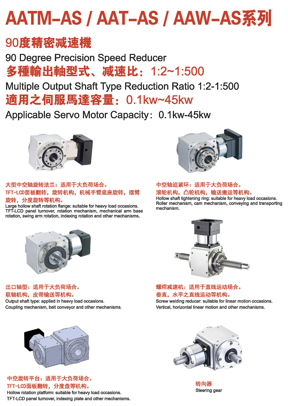 多樣化:輸出軸種類多樣化,有單出力軸型、雙出力軸型、中空軸型、中空法蘭型、中空軸錐形緊迫性、螺桿直線型、螺牙直線型。