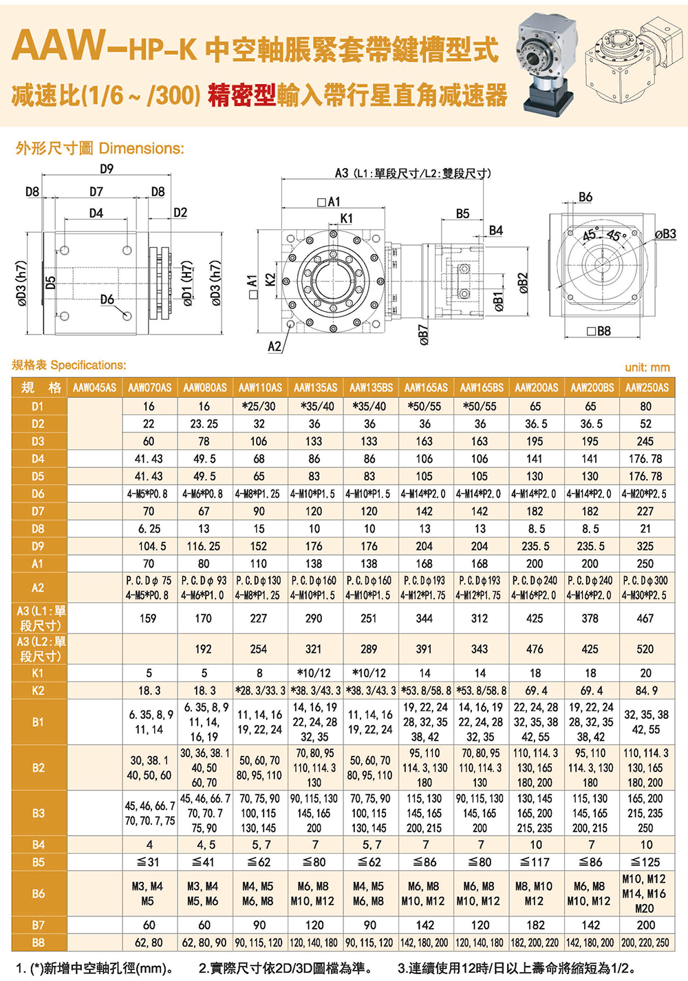 多樣化:輸出軸種類多樣化,有單出力軸型、雙出力軸型、中空軸型、中空法蘭型、中空軸錐形緊迫性、螺桿直線型、螺牙直線型。