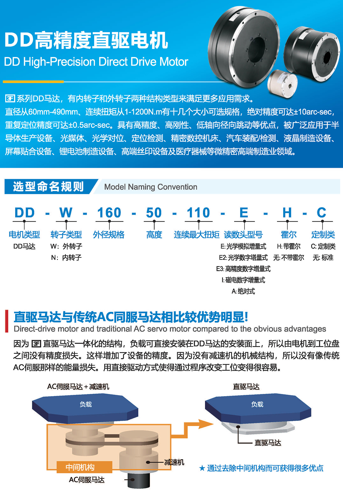 直徑從60mm-490mm、連續(xù)扭矩從1-1200N.m有十幾個(gè)大小可選規(guī)格,絕對(duì)精度可達(dá)±10arc-sec,重復(fù)定位精度可達(dá)0.5arc-sec。具有高精度、高剛性、低軸向徑向跳動(dòng)等優(yōu)點(diǎn),被廣泛應(yīng)用于半導(dǎo)體生產(chǎn)設(shè)備、光媒體、光學(xué)對(duì)位、定位檢測(cè)、精密數(shù)控機(jī)床、汽車裝配檢測(cè)、液晶制造設(shè)備、屏幕貼合設(shè)備、鋰電池制造設(shè)備、高端絲印設(shè)備及醫(yī)療器械等微精密高端制造業(yè)領(lǐng)域.