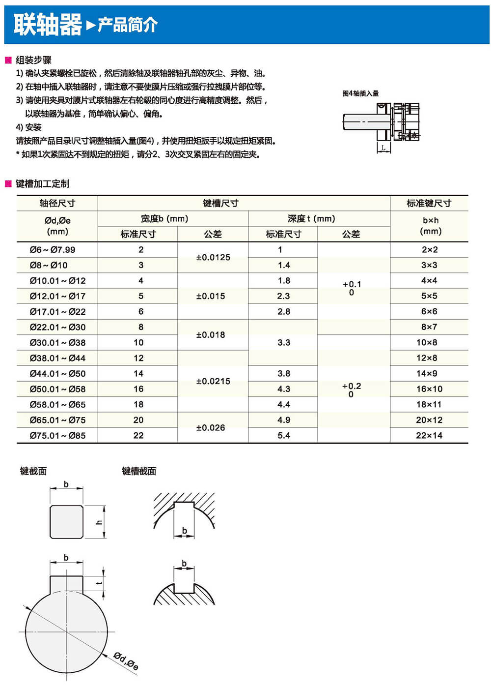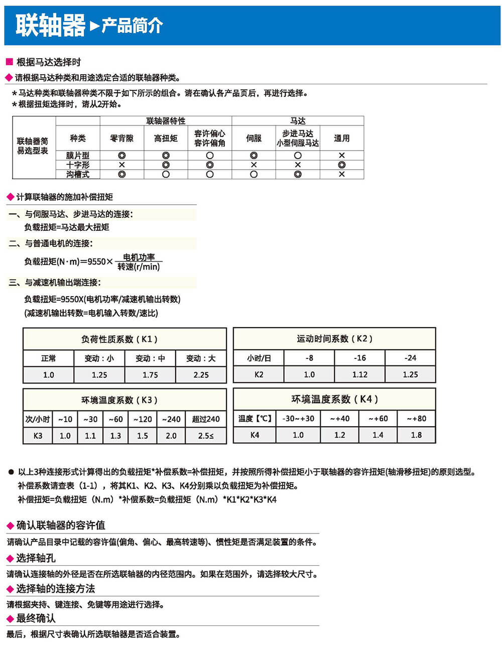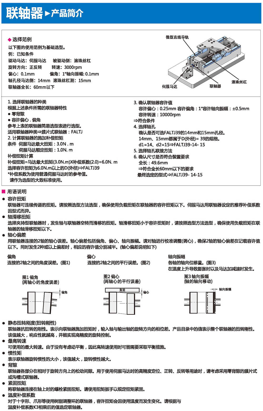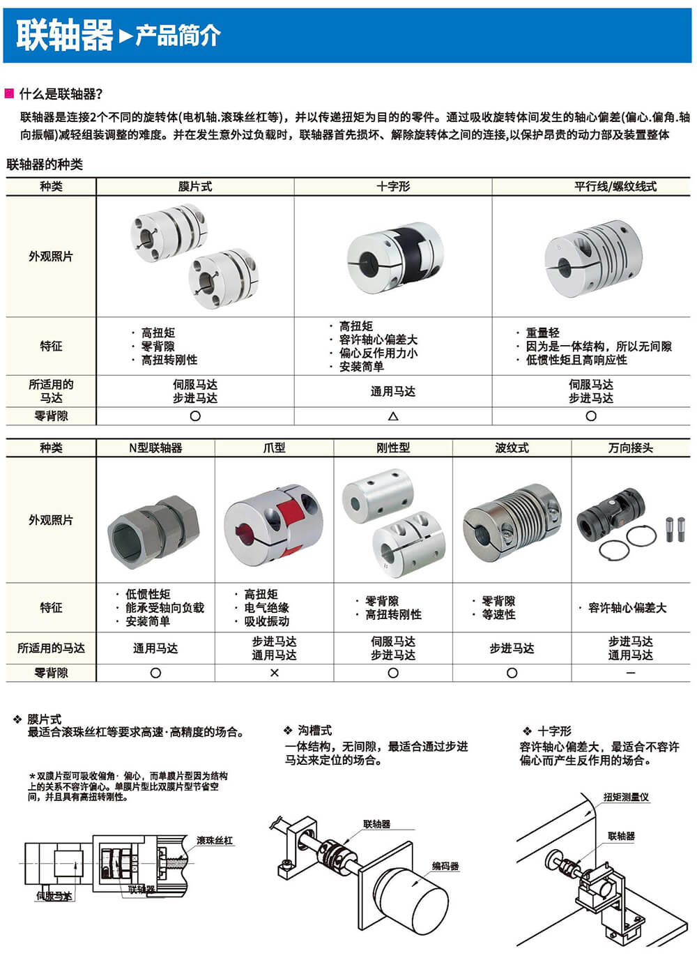 聯(lián)軸器是連接2個(gè)不同的旋轉(zhuǎn)體(電機(jī)軸,滾珠絲杠等),并以傳遞扭矩為目的的零件。通過(guò)吸收旋轉(zhuǎn)體間發(fā)生的軸心偏差(偏心.偏角.軸向振幅)減輕組裝調(diào)整的難度。并在發(fā)生意外過(guò)負(fù)載時(shí),聯(lián)軸器首先損壞、解除旋轉(zhuǎn)體之間的連接,以保護(hù)昂貴的動(dòng)力部及裝置整體。