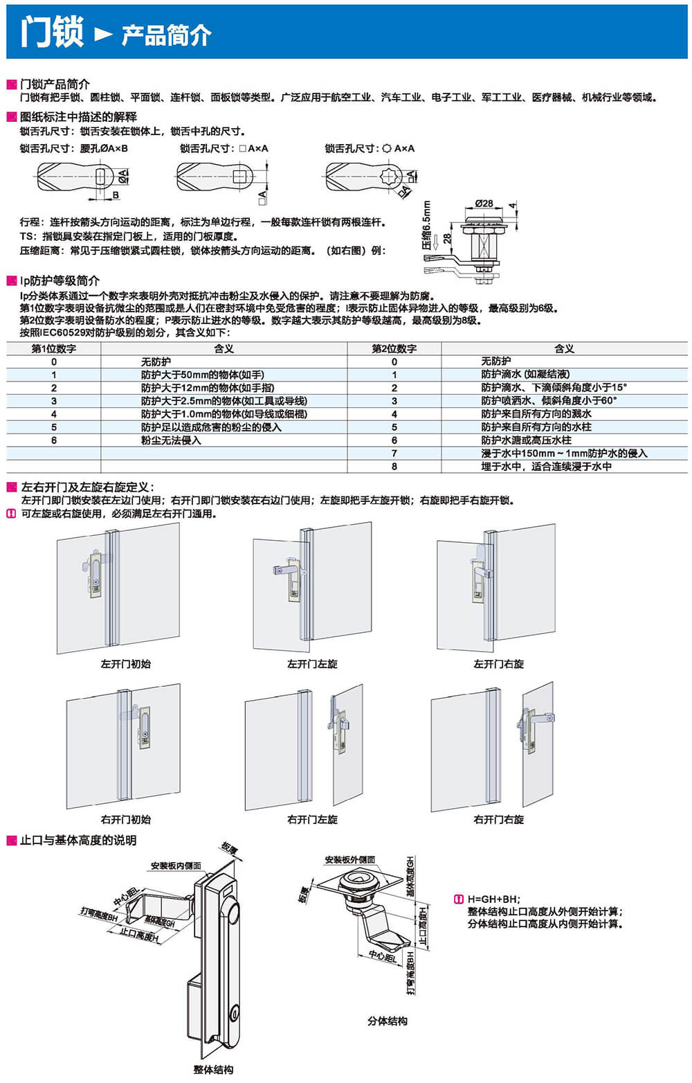 門鎖有把手鎖、圓柱鎖、平面鎖、連桿鎖、面板鎖等類型。廣泛應(yīng)用于航空工業(yè)、汽車工業(yè)、電子工業(yè)、軍工工業(yè)、醫(yī)療器械、機(jī)械行業(yè)等領(lǐng)域。