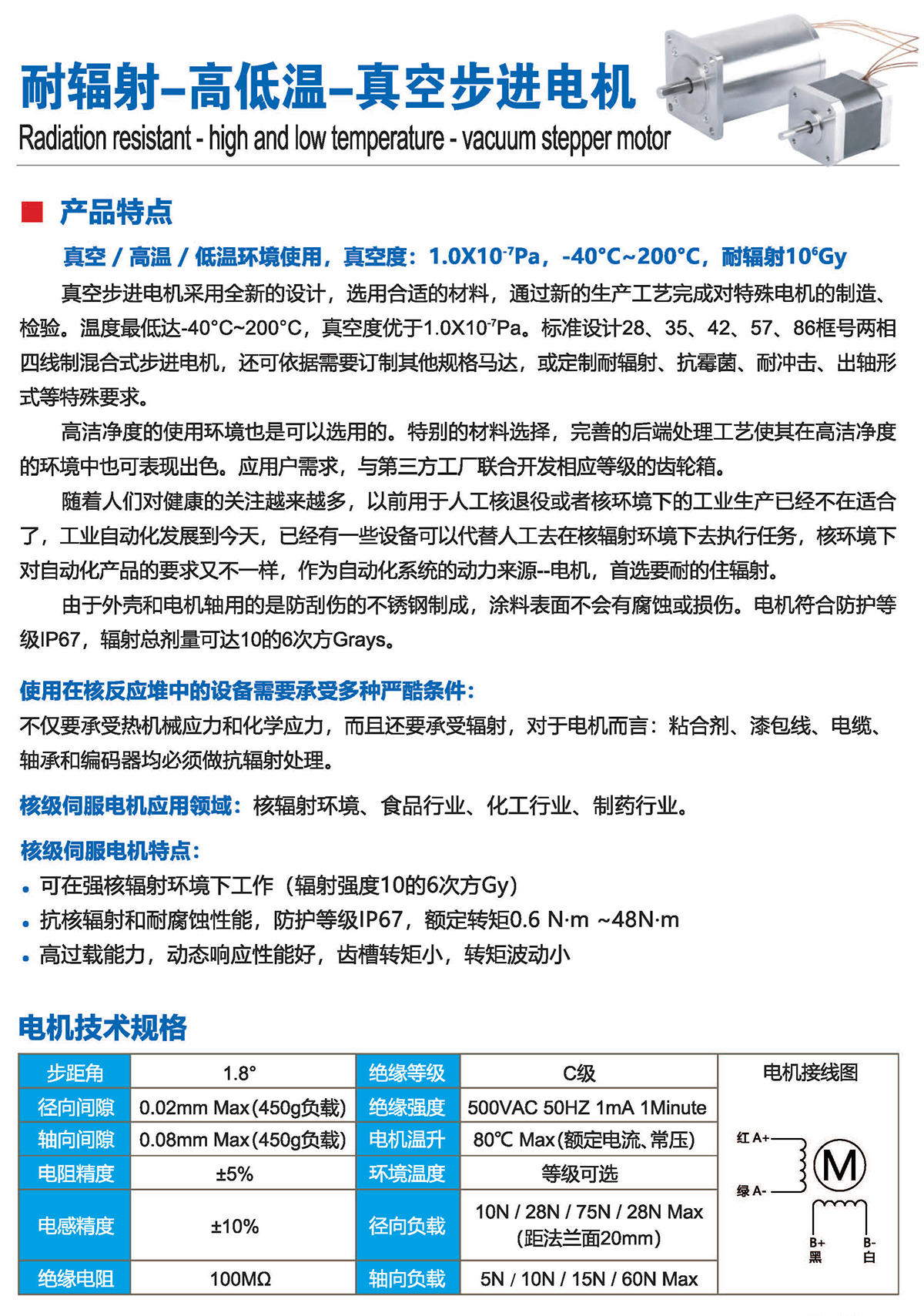 隨著人們對健康的關(guān)注越來越多,以前用于人工核退役或者核環(huán)境下的工業(yè)生產(chǎn)已經(jīng)不在適合了,工業(yè)自動化發(fā)展到今天,已經(jīng)有一些設(shè)備可以代替人工去在核輻射環(huán)境下去執(zhí)行任務(wù),核環(huán)境下對自動化產(chǎn)品的要求又不一樣,作為自動化系統(tǒng)的動力來源--電機(jī),首選要耐的住輻射。