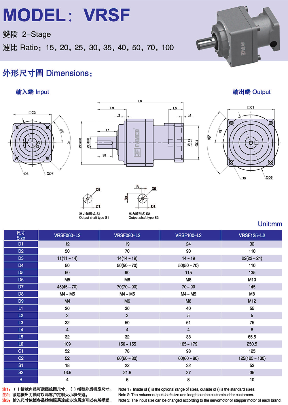 多樣化:輸出軸種類多樣化,有單出力軸型、雙出力軸型、中空軸型、中空法蘭型、中空軸錐形緊迫性、螺桿直線型、螺牙直線型。