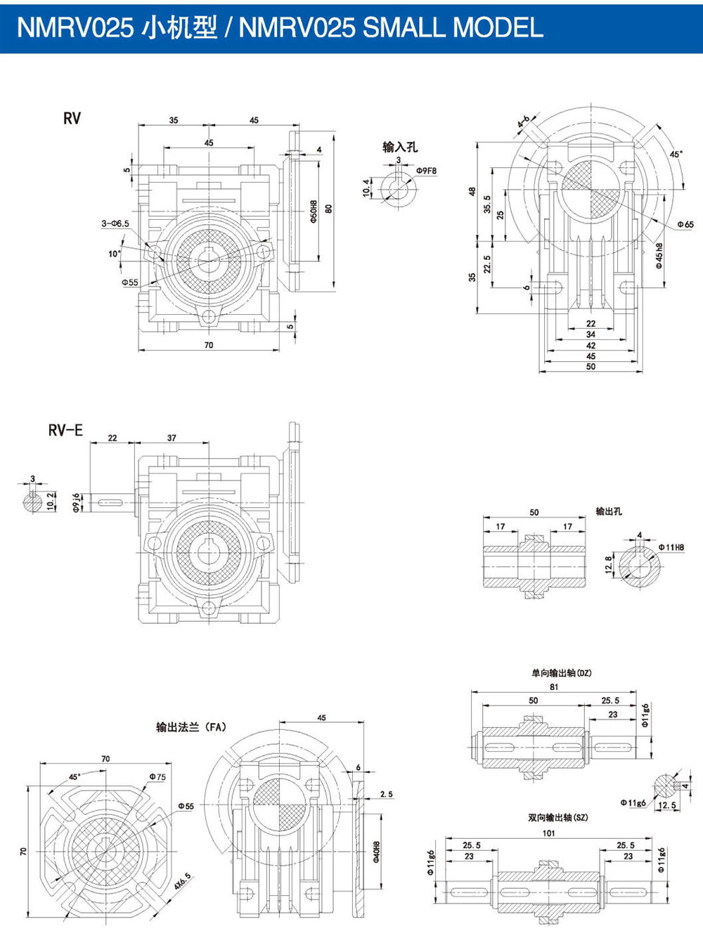 多樣化:輸出軸種類多樣化,有單出力軸型、雙出力軸型、中空軸型、中空法蘭型、中空軸錐形緊迫性、螺桿直線型、螺牙直線型。