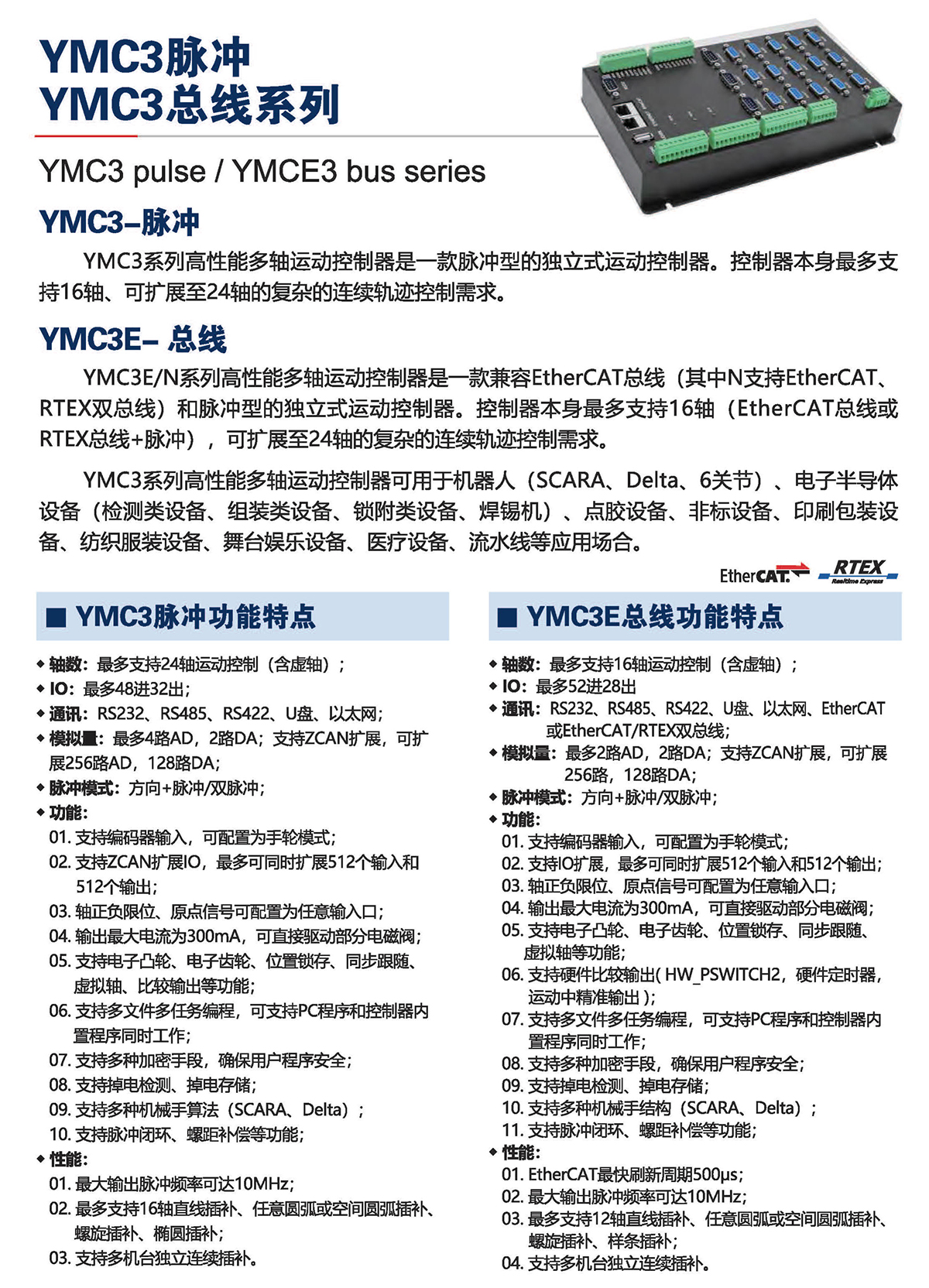 YMC3E/N系列高性能多軸運(yùn)動(dòng)控制器是一款兼容EtherCAT總線 (其中N支持EtherCAT.RTEX雙總線)和脈沖型的獨(dú)立式運(yùn)動(dòng)控制器。控制器本身最多支持16軸( EtherCAT總線或RTEX總線+脈沖) , 可擴(kuò)展至24軸的復(fù)雜的連續(xù)軌跡控制需求。