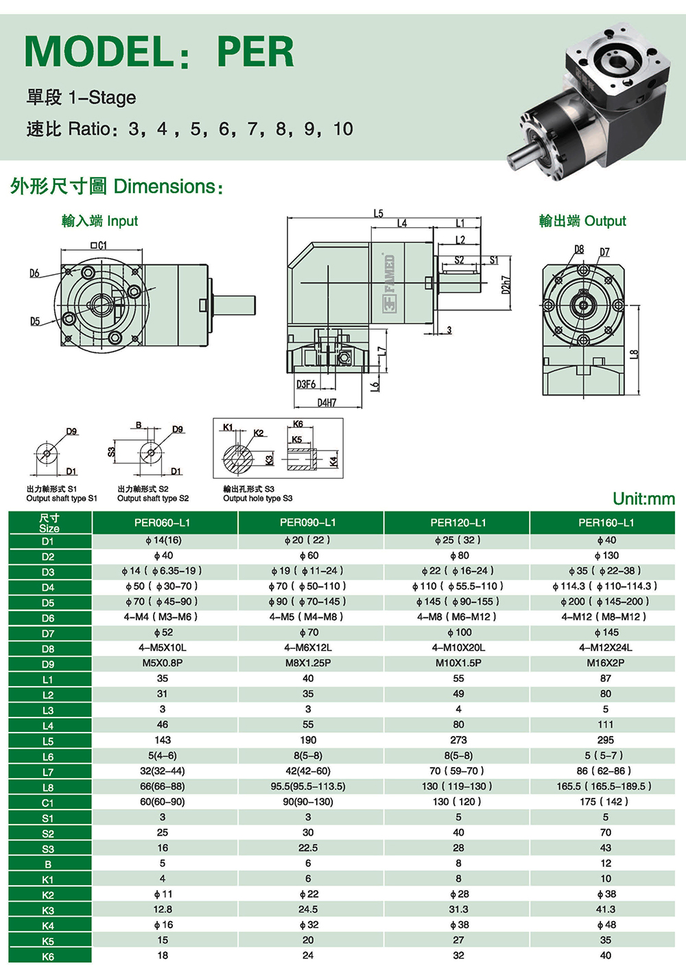 多樣化:輸出軸種類多樣化,有單出力軸型、雙出力軸型、中空軸型、中空法蘭型、中空軸錐形緊迫性、螺桿直線型、螺牙直線型。
