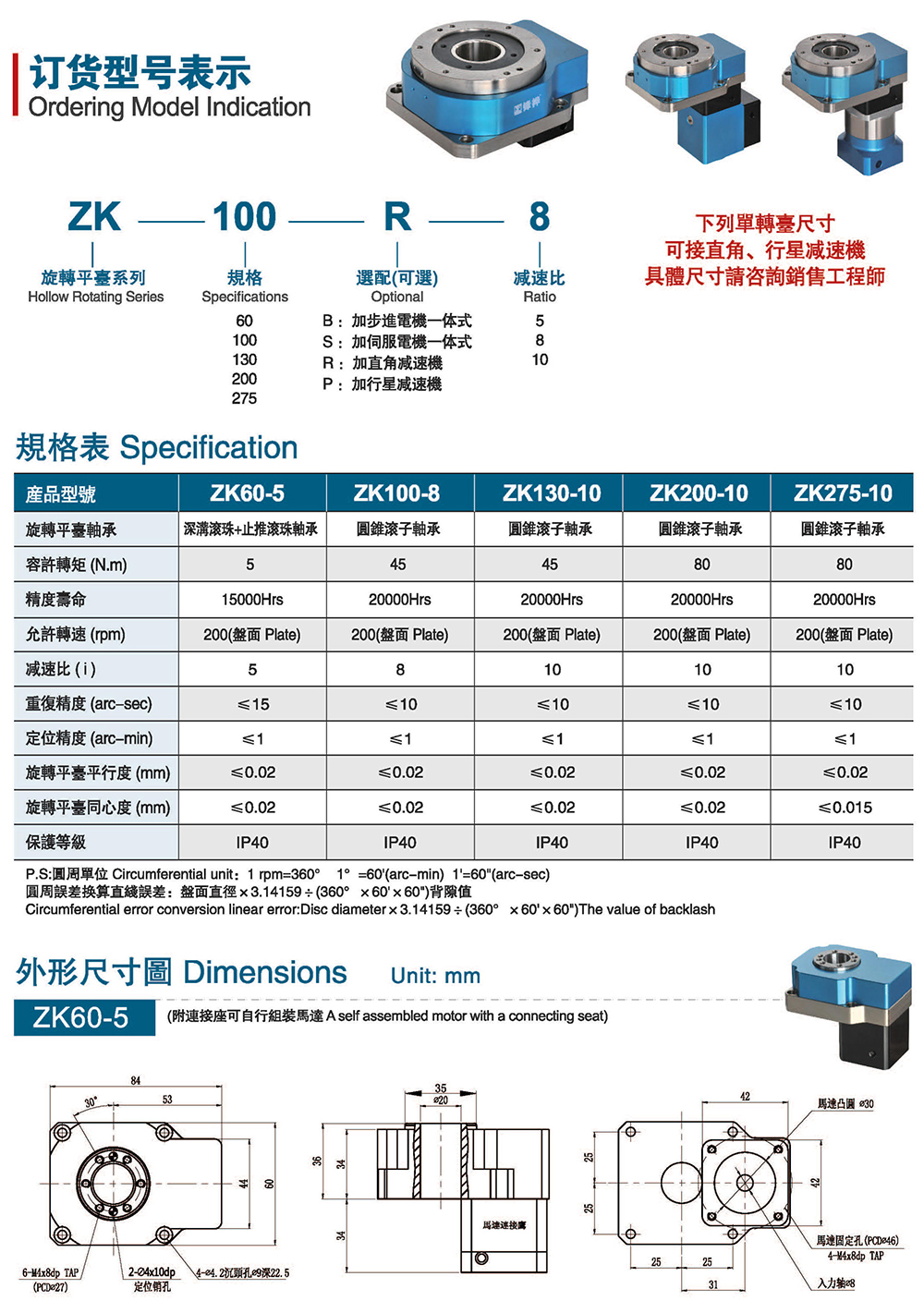 中空的輸出平臺上,可直接安裝設(shè)備的工作臺及機(jī)器手臂。一般設(shè)備在通過皮帶輪等機(jī)構(gòu)零件進(jìn)行定位運行時,多受機(jī)構(gòu)零件傳動效率的影響發(fā)生精度減低,或有維修機(jī)構(gòu)零件的必要。而zK系列因不需通過中間零件,便可直接安裝,所以除了能直接運用產(chǎn)品本身的精度以外,也可以免去維修的麻煩。