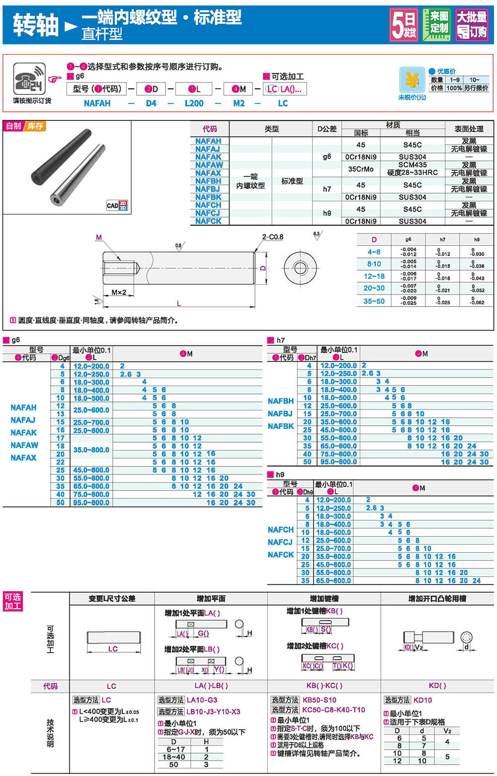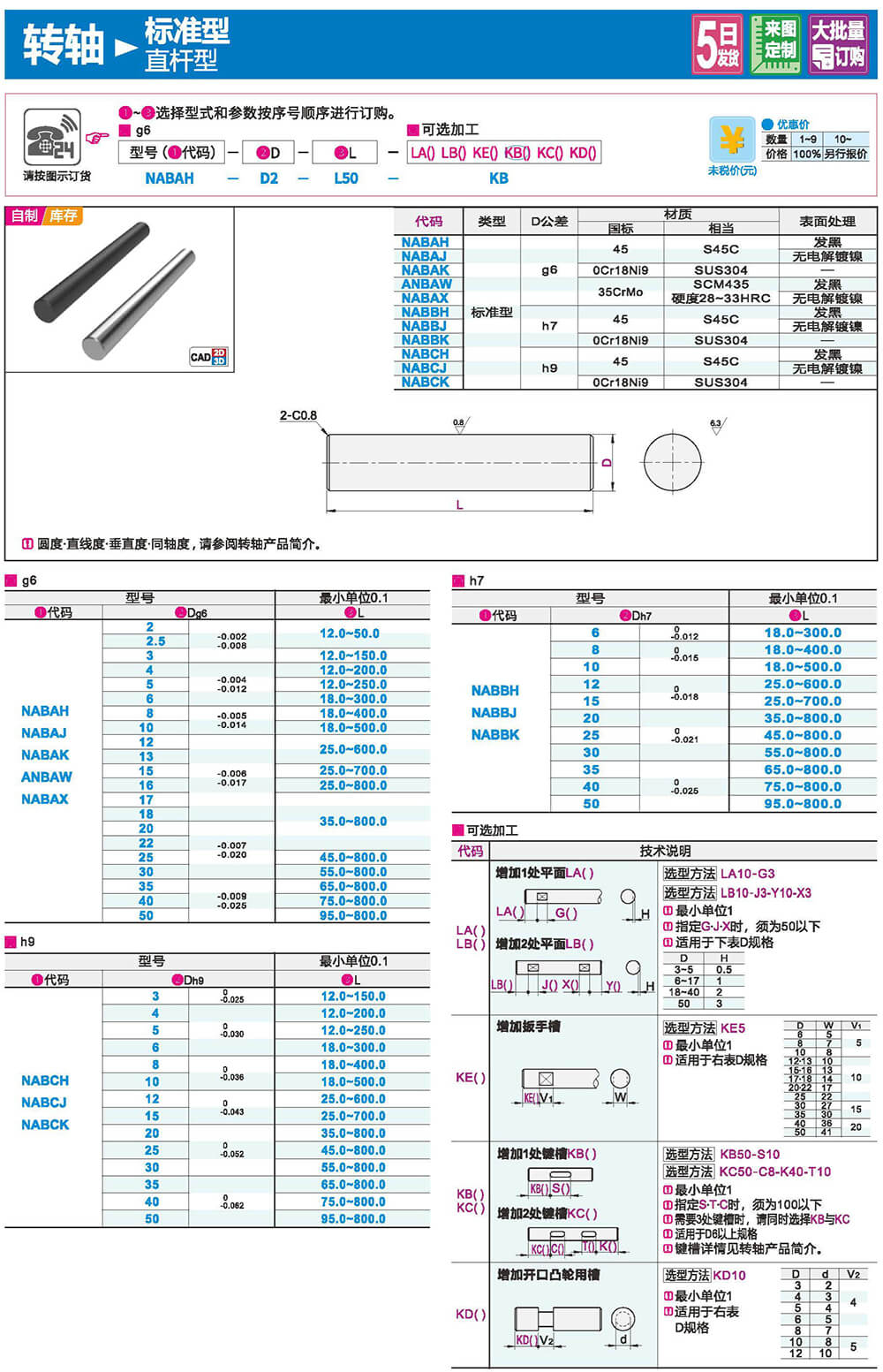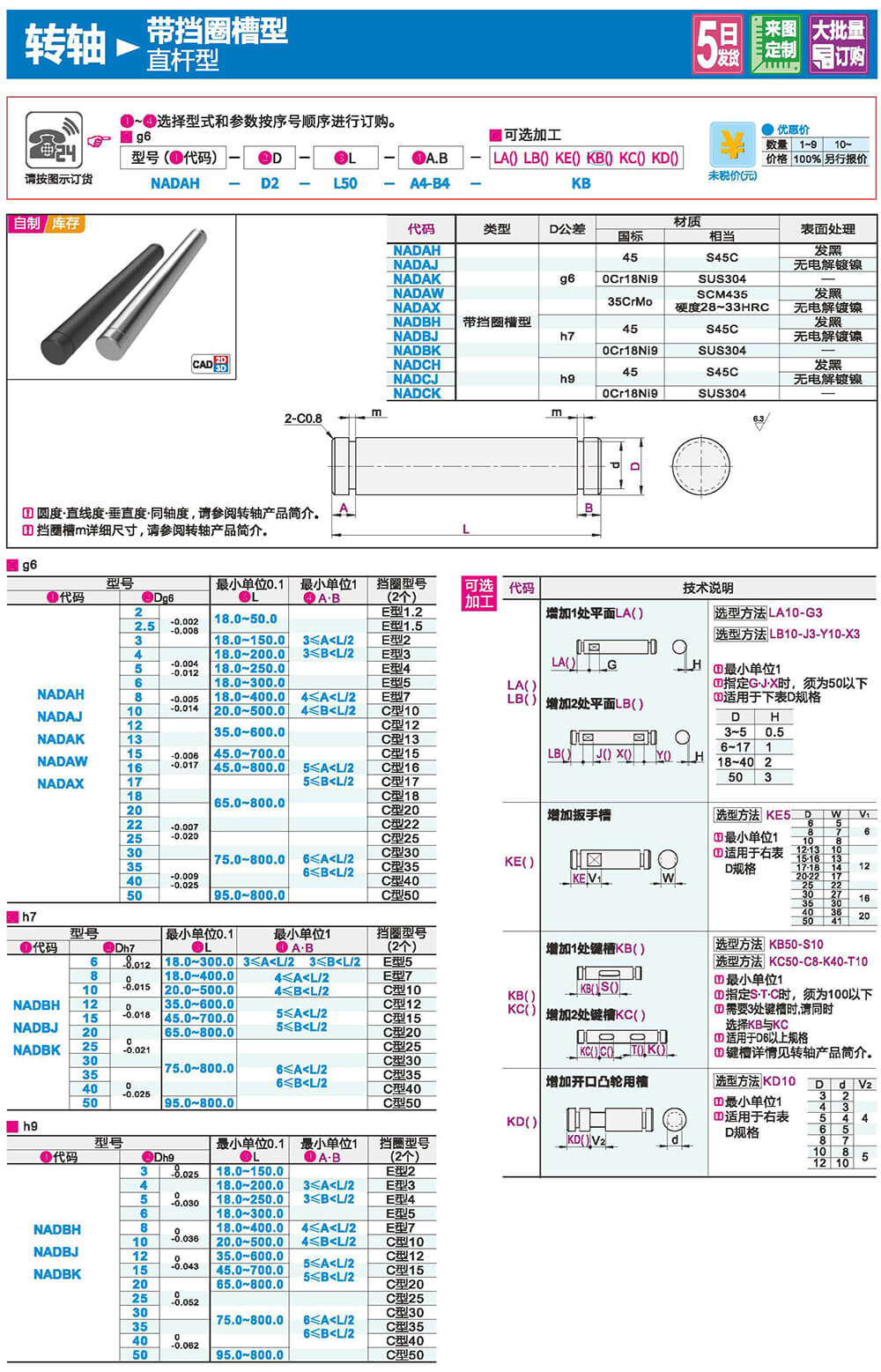 用于傳遞動(dòng)力、傳送物體等旋轉(zhuǎn)用途的軸??勺鳛檩S承、帶輪、滾輪的軸使用。 備有便于組裝的h9、h7。g6公差??勺芳渔I槽、扣環(huán)槽。平面、扳手槽等加工。