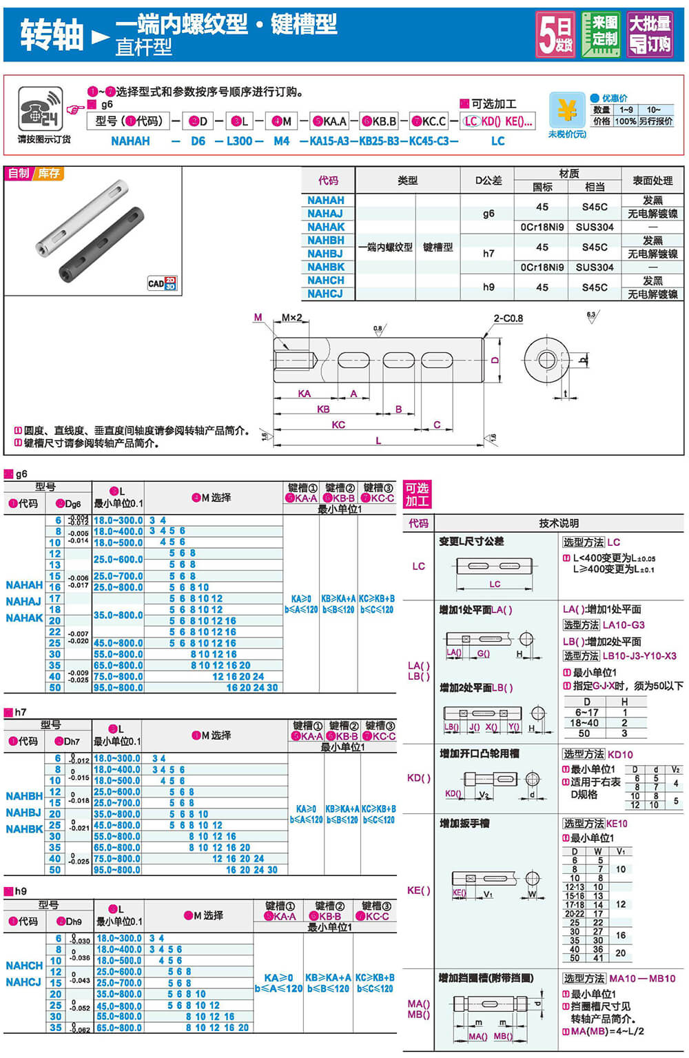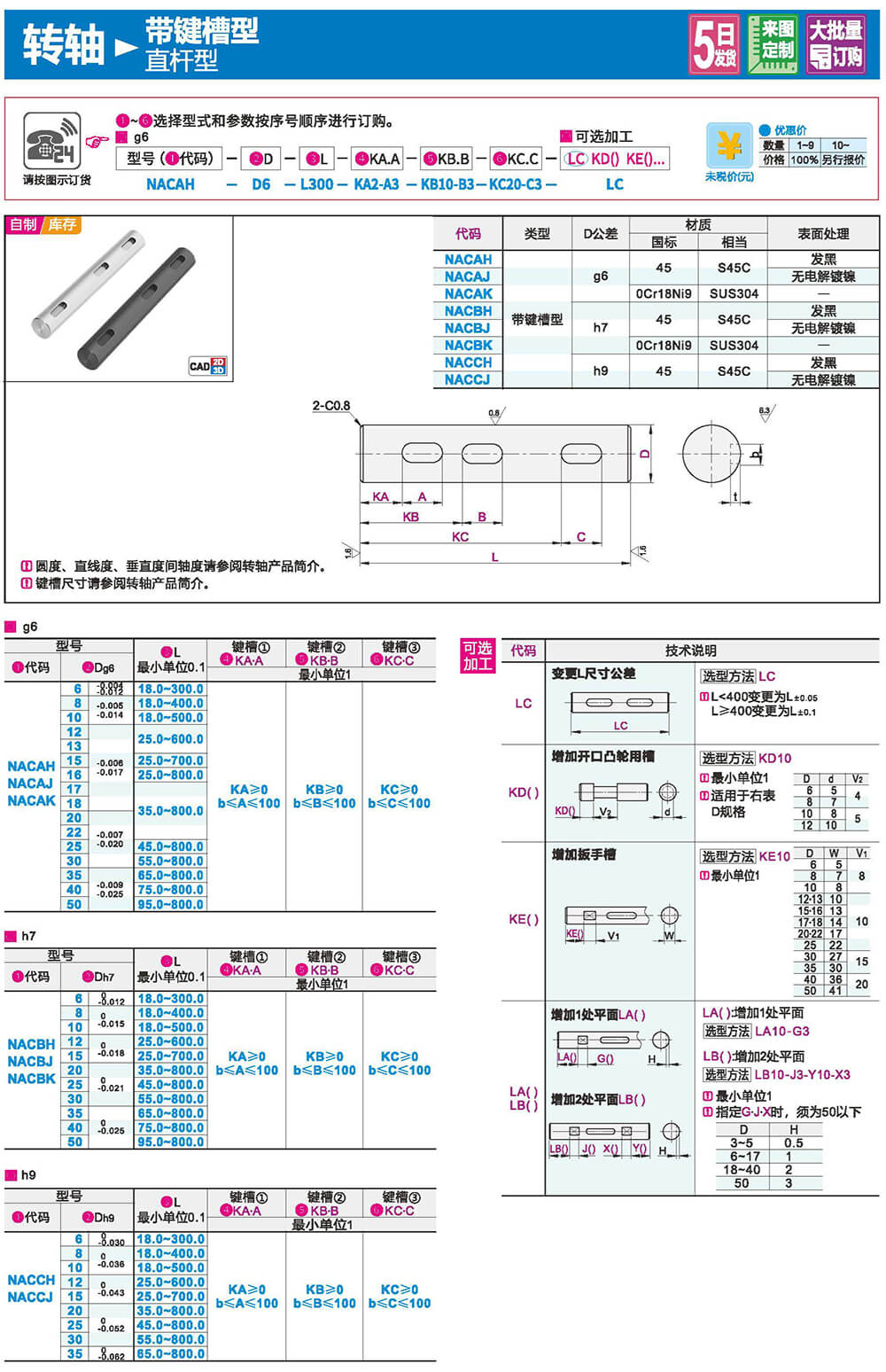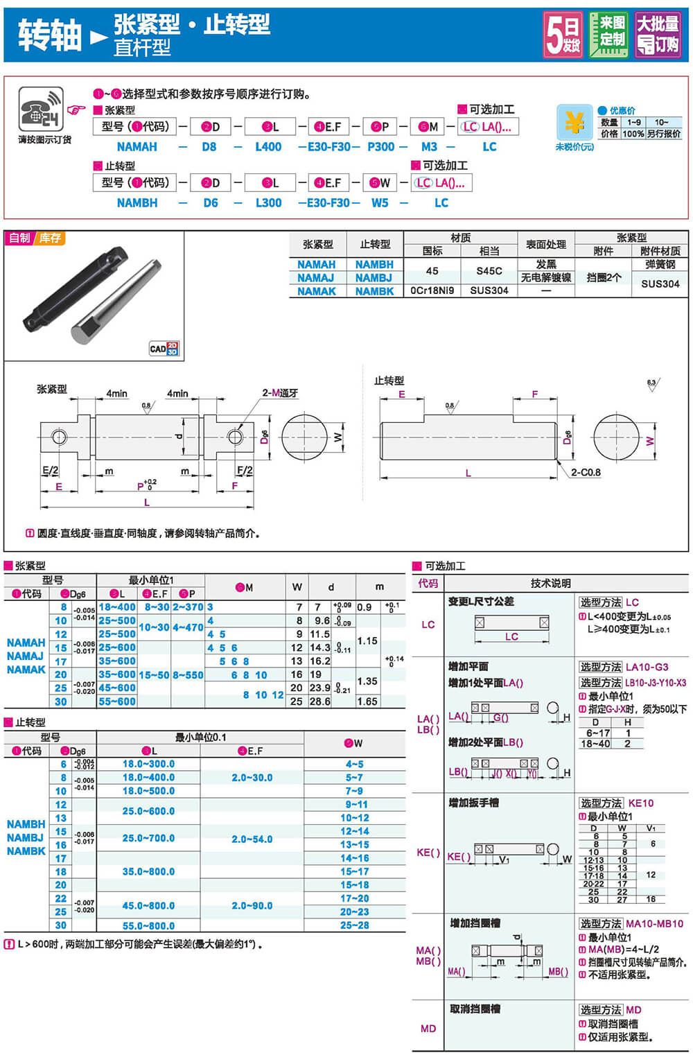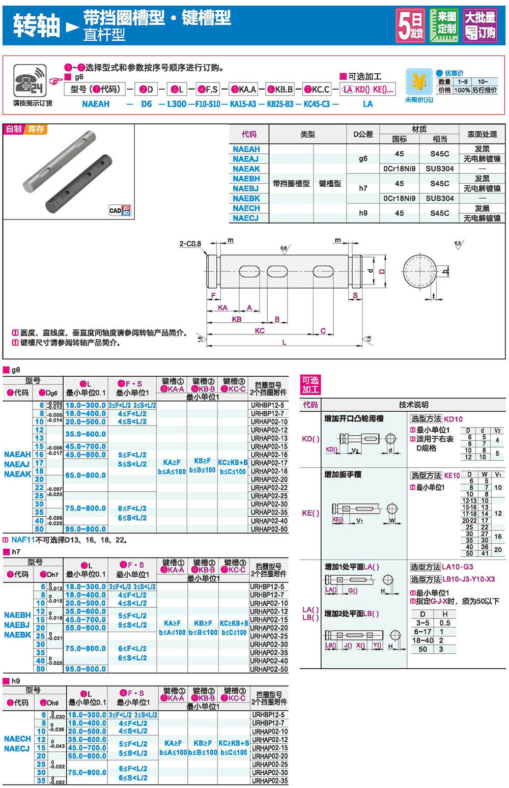 用于傳遞動(dòng)力、傳送物體等旋轉(zhuǎn)用途的軸??勺鳛檩S承、帶輪、滾輪的軸使用。 備有便于組裝的h9、h7。g6公差??勺芳渔I槽、扣環(huán)槽。平面、扳手槽等加工。