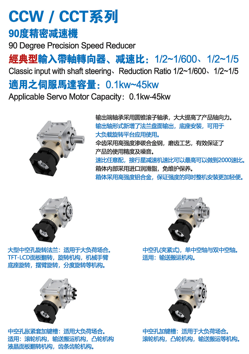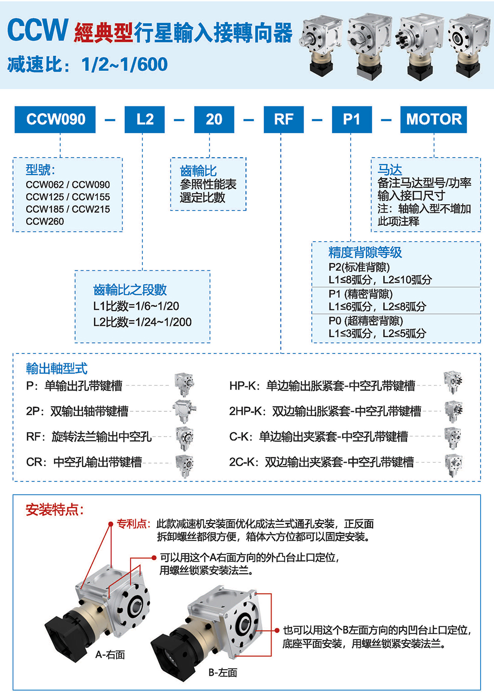 多樣化:輸出軸種類多樣化,有單出力軸型、雙出力軸型、中空軸型、中空法蘭型、中空軸錐形緊迫性、螺桿直線型、螺牙直線型。