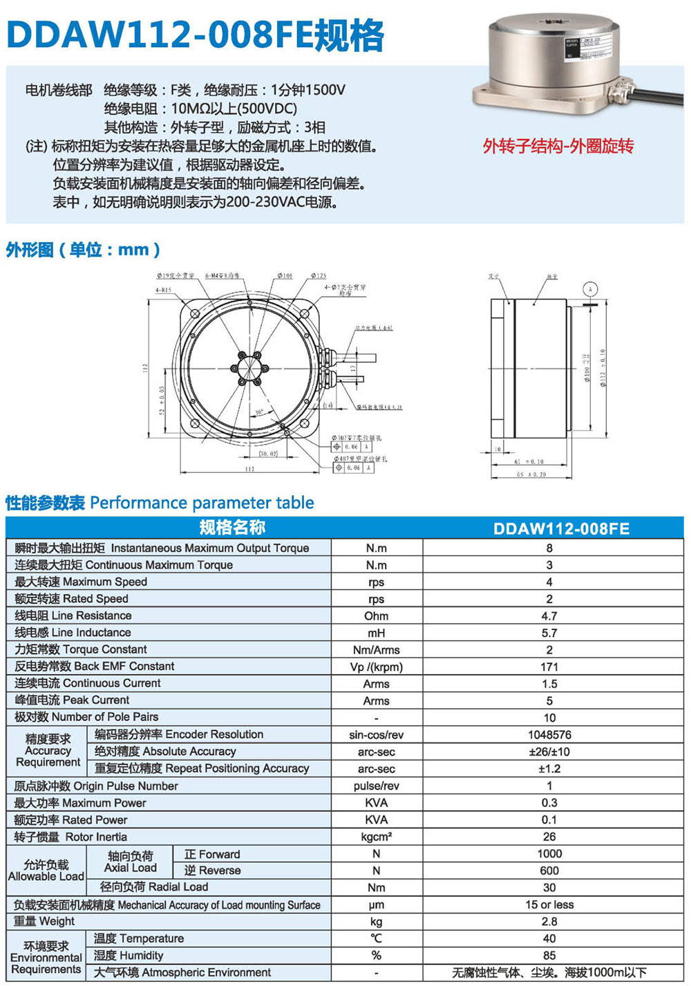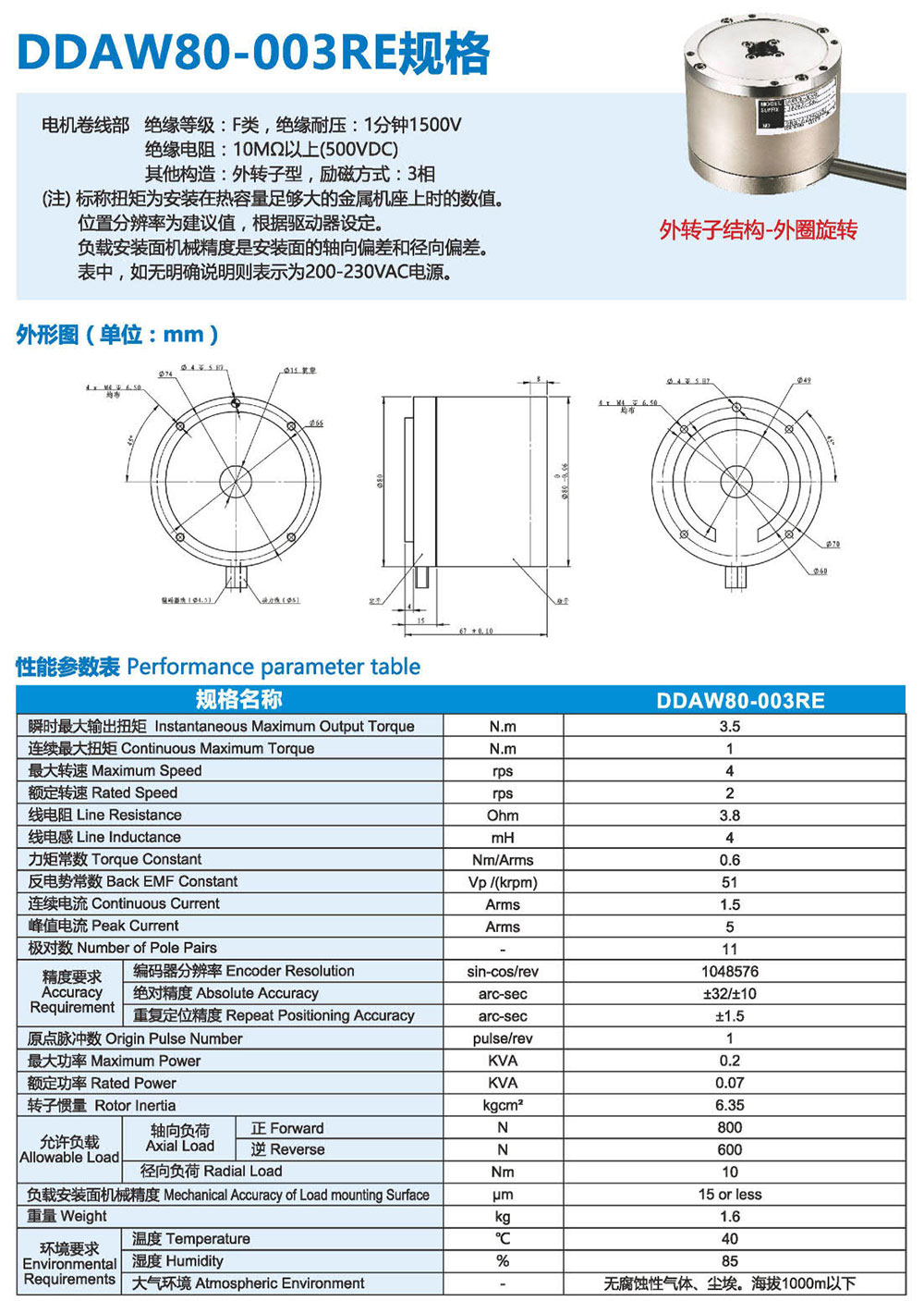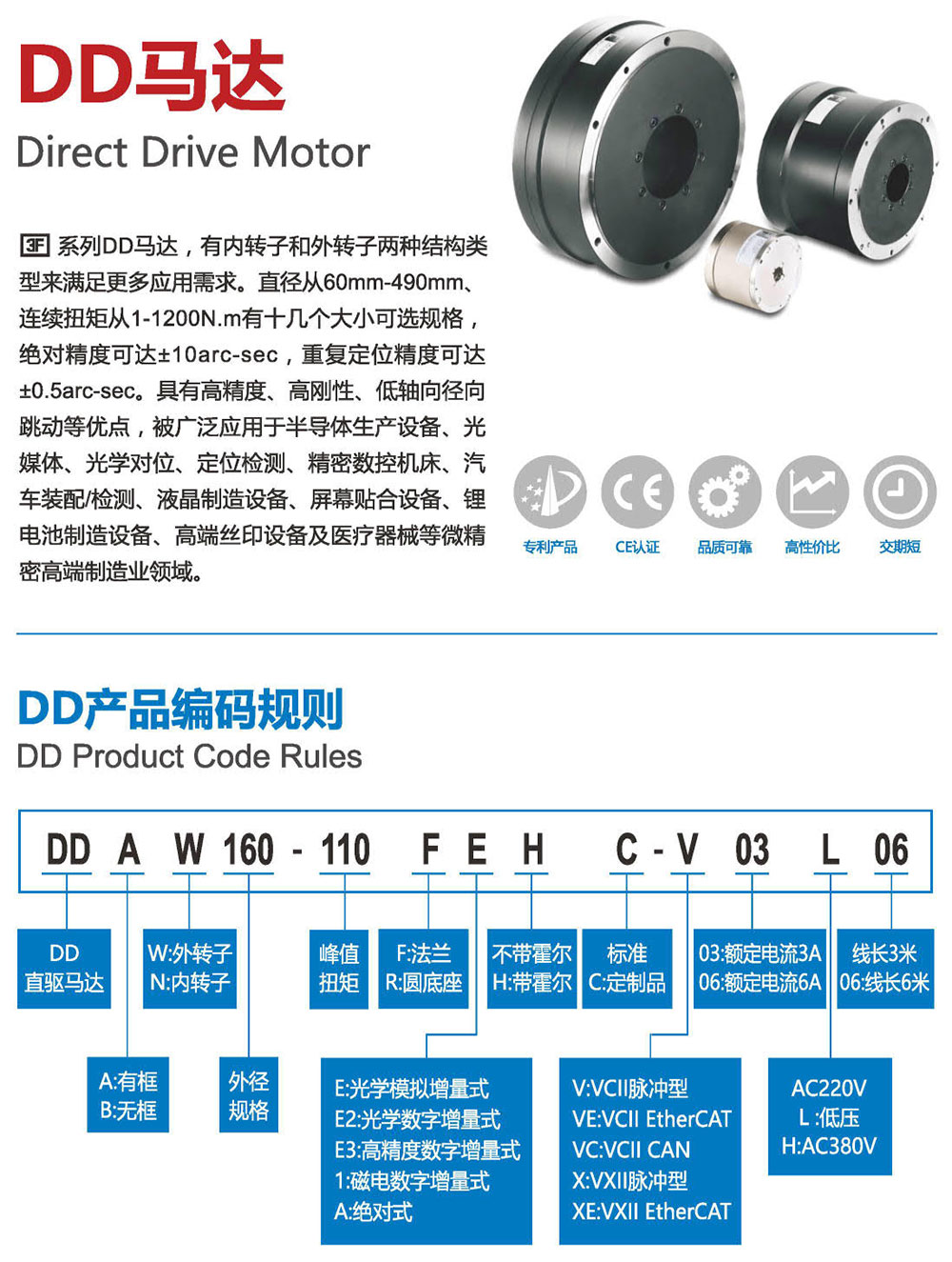 3F系列DD馬達,有內(nèi)轉(zhuǎn)子和外轉(zhuǎn)子兩種結(jié)構(gòu)類 型來滿足更多應用需求。直徑從60mm- 490mm、 連續(xù)扭矩從1-1200N.m有十幾個大小可選規(guī)格, 精度可達+10arc-sec,重復定位精度可達 +0.5arc-sec。具有高精度、高剛性、低軸向徑向 跳動等優(yōu)點,被廣泛應用于半導體生產(chǎn)設備、光 媒體、光學對位、定位檢測、精密數(shù)控機床、汽 車裝配/檢測、液晶制造設備、屏幕貼合設備、鋰 電池制造設備、高端絲印設備及醫(yī)療器械等微精 密高端制造業(yè)領(lǐng)域。