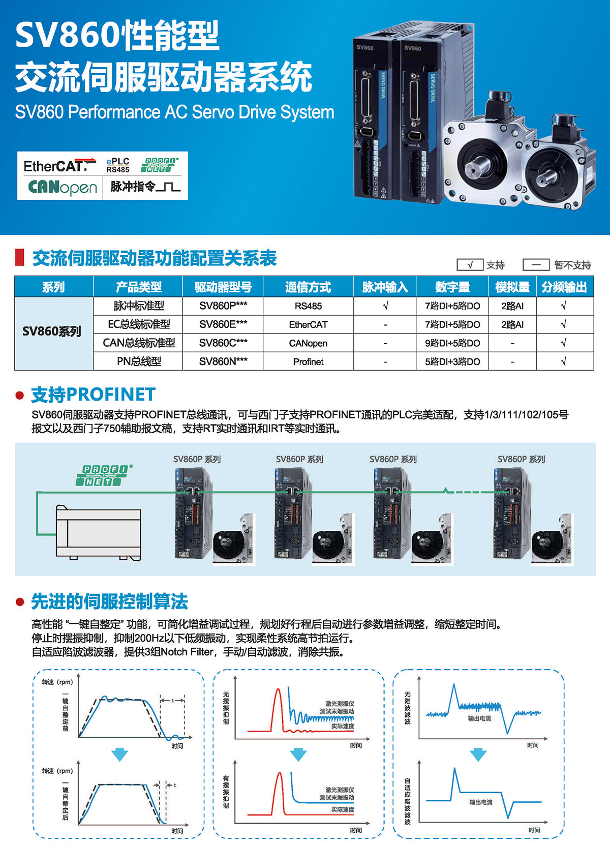 SV860伺服驅(qū)動器支持PROFINET總線通訊,可與西門子支持PROFINET通訊的PLC完美適配,支持13/111/102/105號報文以及西門子750輔助報文稿,支持RT實時通訊和IRT等實時通訊。