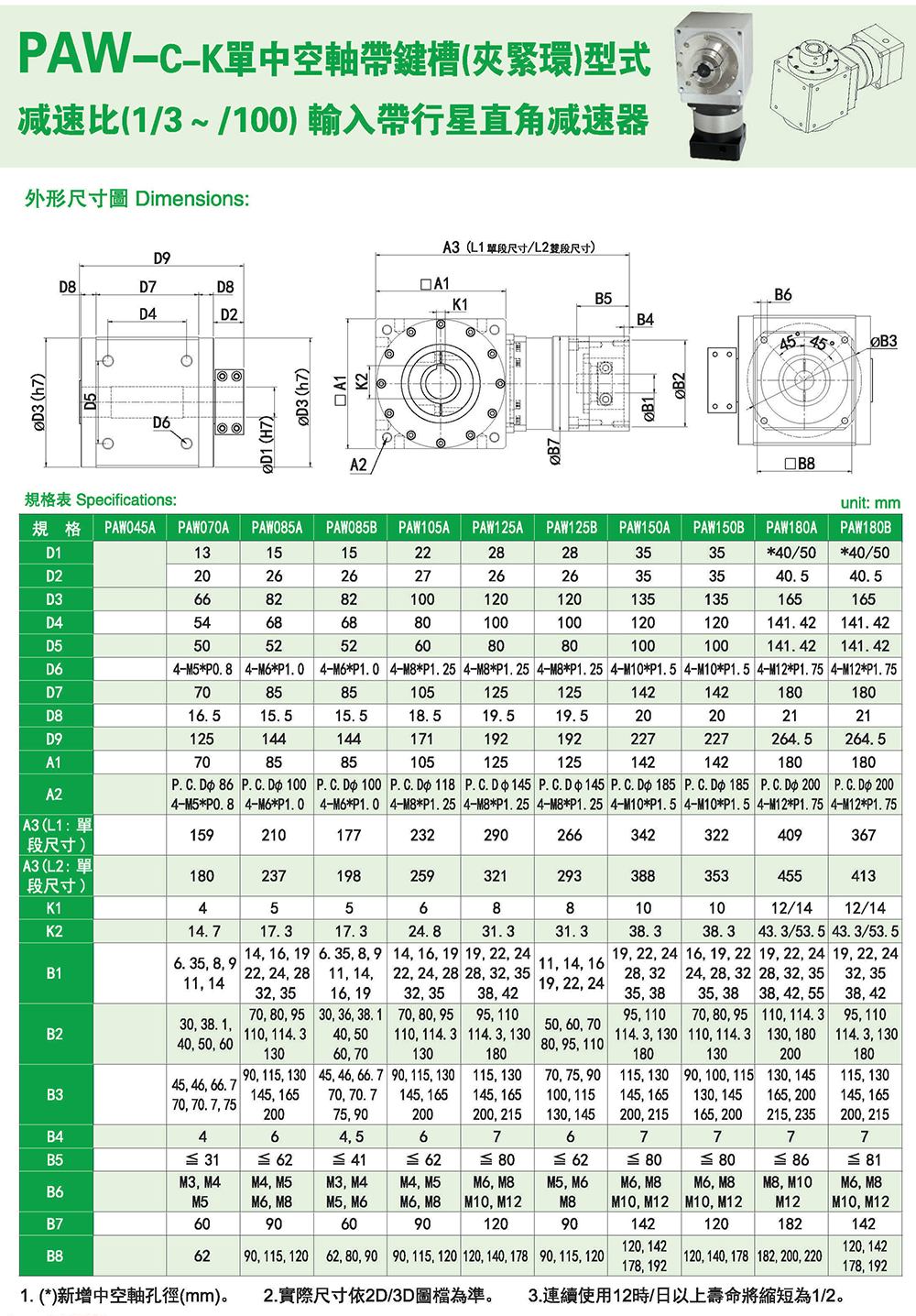 多樣化:輸出軸種類多樣化,有單出力軸型、雙出力軸型、中空軸型、中空法蘭型、中空軸錐形緊迫性、螺桿直線型、螺牙直線型。