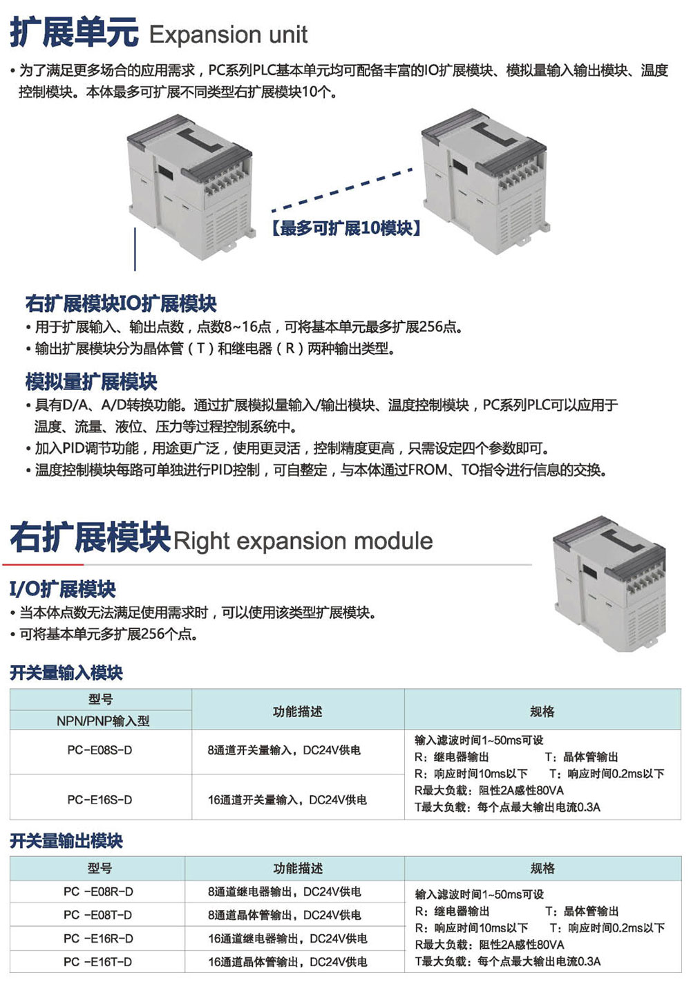 為了滿足更多場合的應(yīng)用需求, PC系列PLC基本單元均可配備豐富的IO擴(kuò)展模塊、模擬量輸入輸出模塊、溫度 控制模塊。本體可擴(kuò)展不同類型右擴(kuò)展模塊10個。