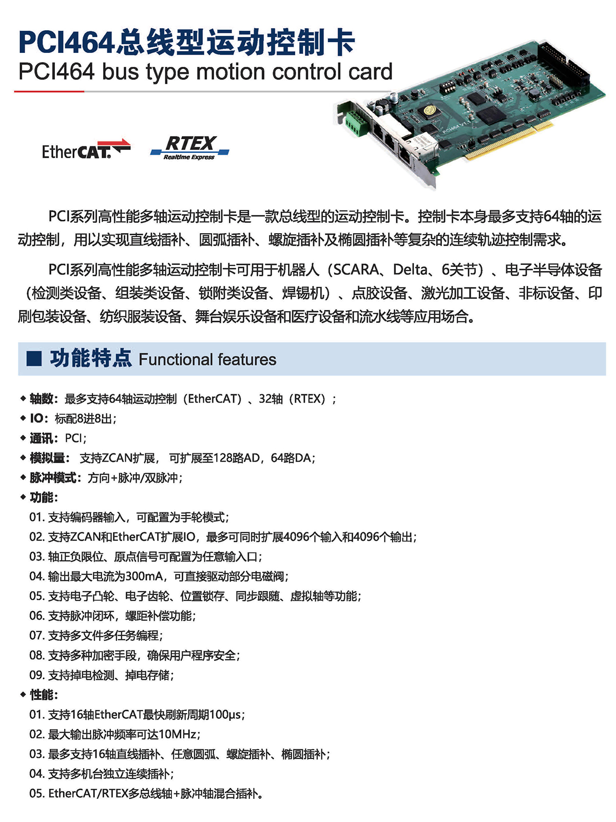 PCI系列高性能多軸運動控制卡是一款總線型的運動控制卡。 控制卡本身支持64軸的運動控制,用以實現(xiàn)直線插補、圓弧插補、螺旋插補及橢圓插補等復雜的連續(xù)軌跡控制需求。