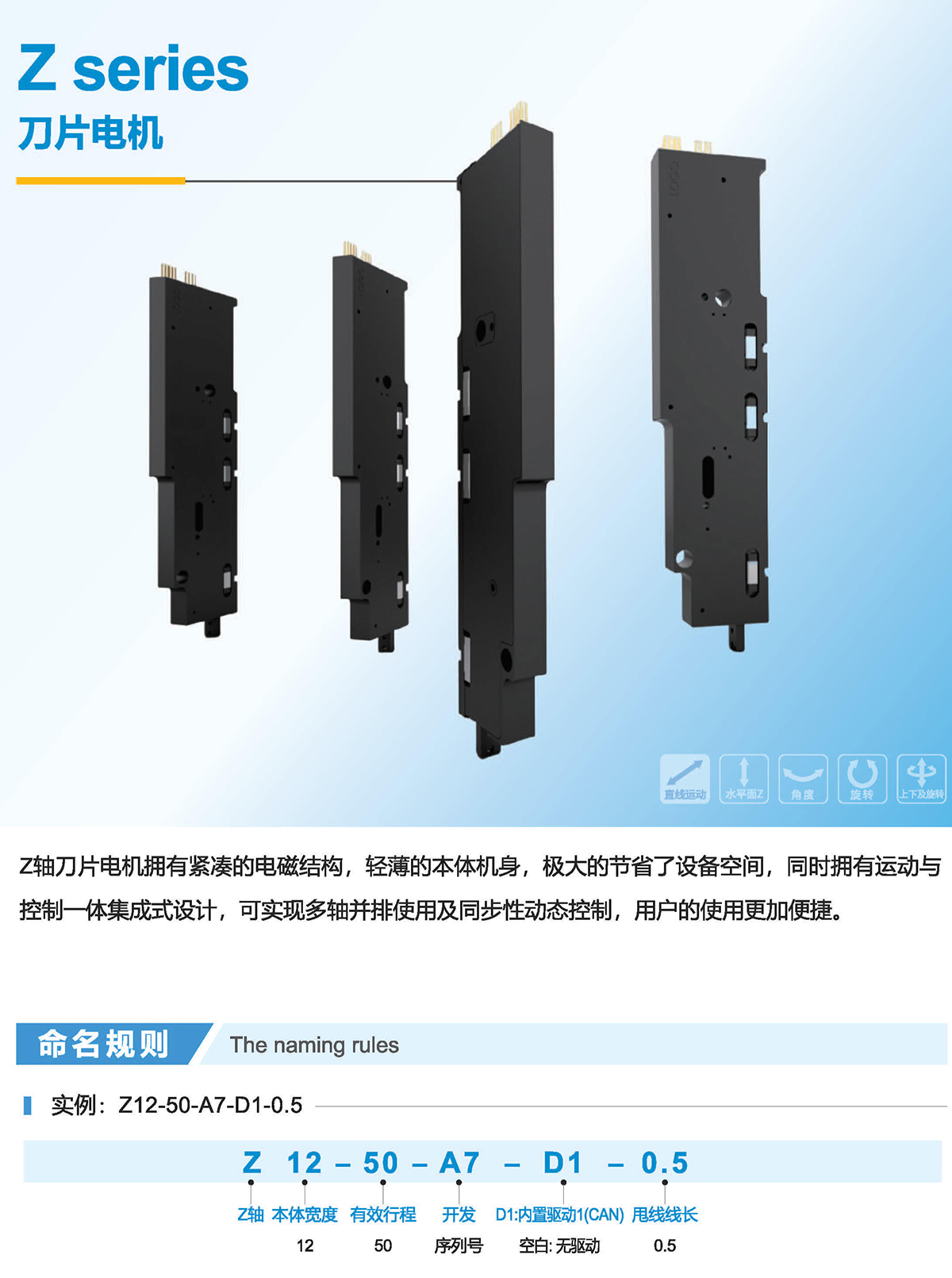 Z軸刀片電機(jī)擁有緊湊的電磁結(jié)構(gòu),輕薄的本體機(jī)身,極大的節(jié)省了設(shè)備空間,同時擁有運(yùn)動與控制一體集成式設(shè)計,可實(shí)現(xiàn)多軸并排使用及同步性動態(tài)控制,用戶的使用更加便捷。