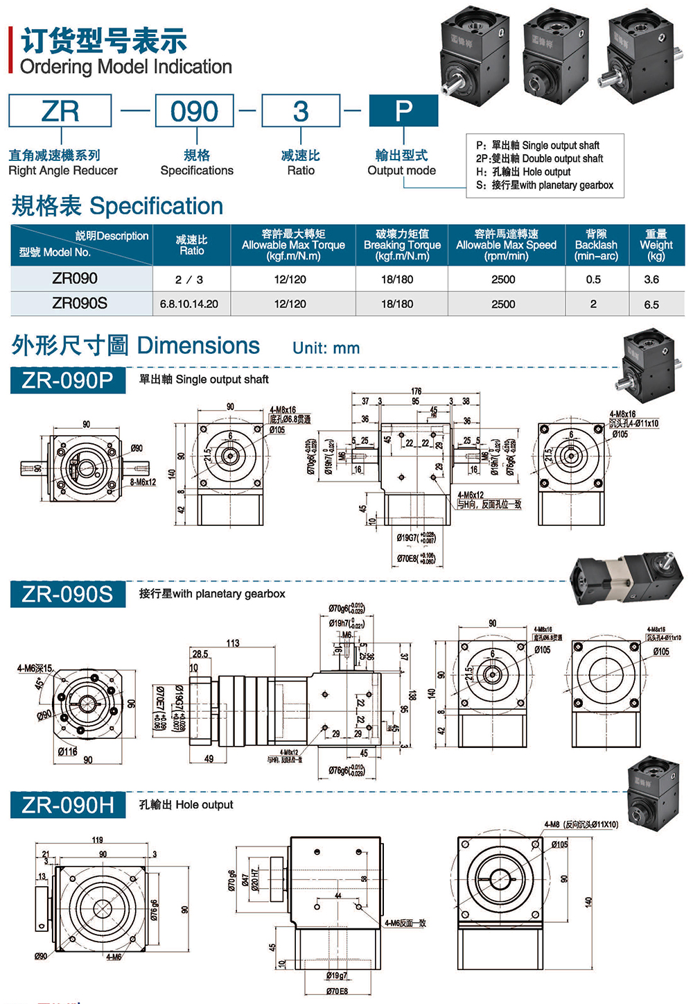 高強(qiáng)度:90度型式,高精度螺旋傘齒輪,采用鎳鉻合金鋼SCM415 HRC60度。