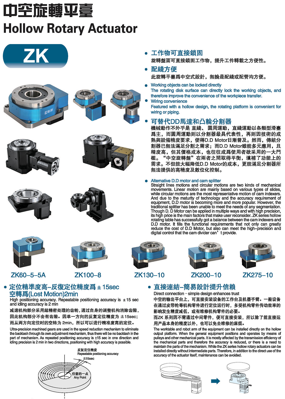 中空的輸出平臺上,可直接安裝設(shè)備的工作臺及機(jī)器手臂。一般設(shè)備在通過皮帶輪等機(jī)構(gòu)零件進(jìn)行定位運行時,多受機(jī)構(gòu)零件傳動效率的影響發(fā)生精度減低,或有維修機(jī)構(gòu)零件的必要。而zK系列因不需通過中間零件,便可直接安裝,所以除了能直接運用產(chǎn)品本身的精度以外,也可以免去維修的麻煩。