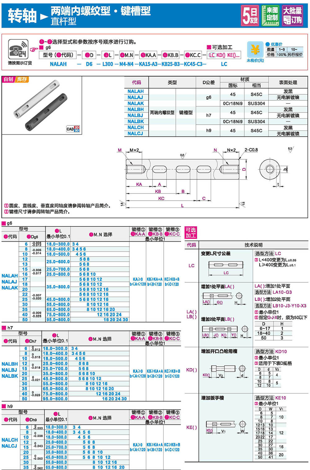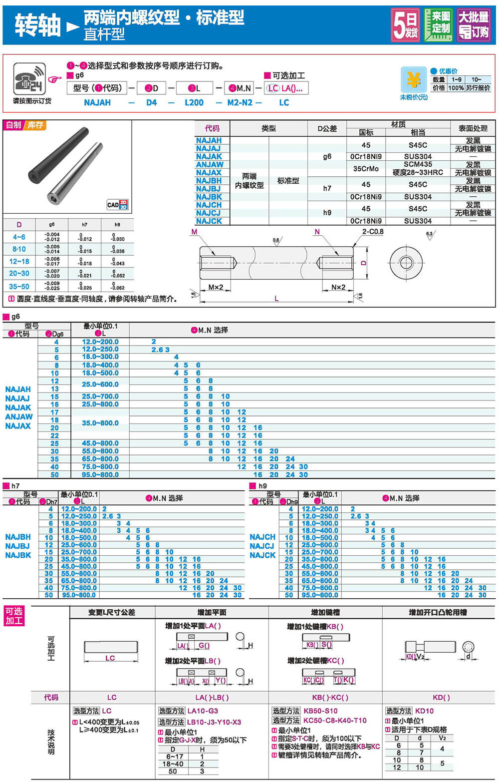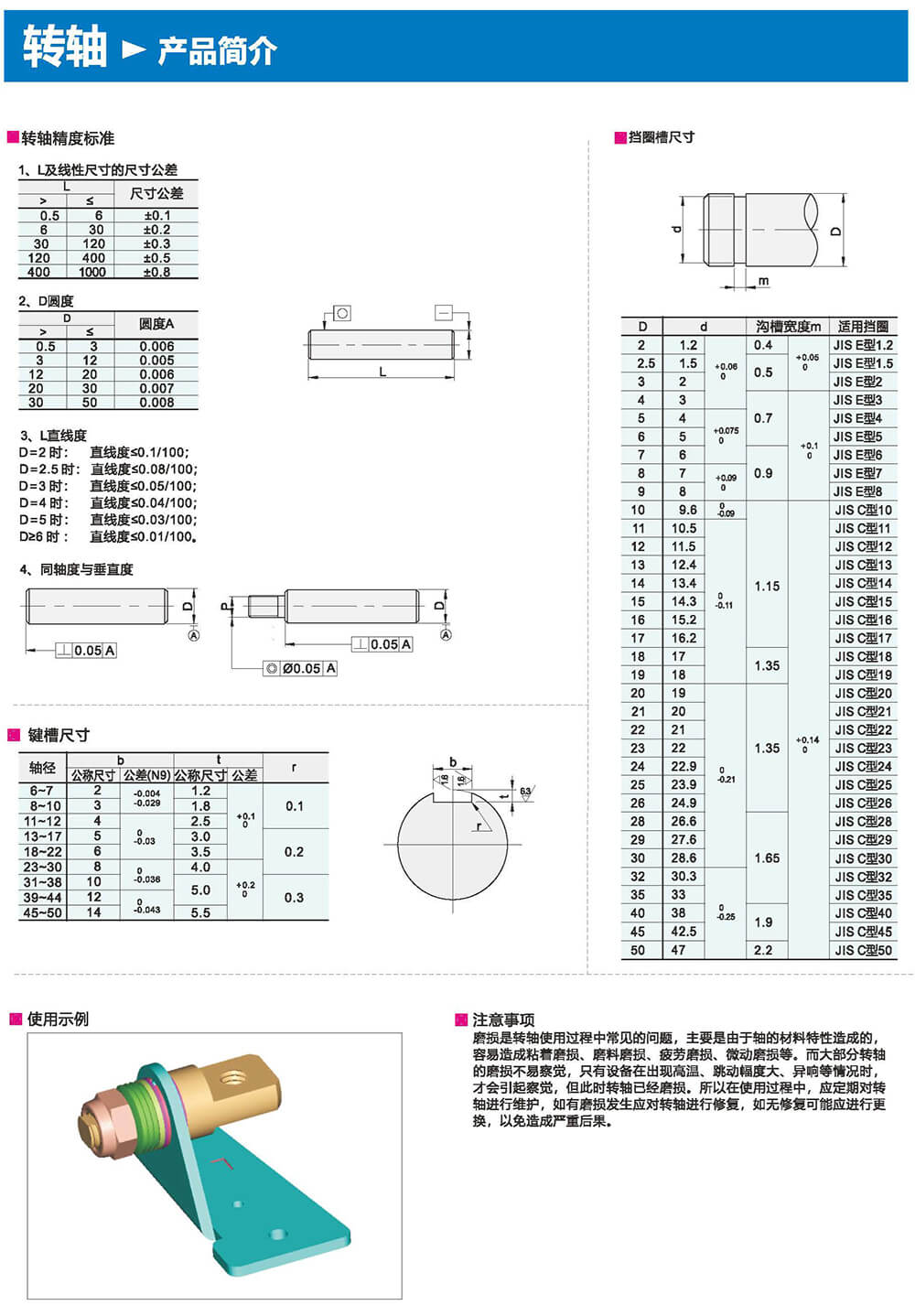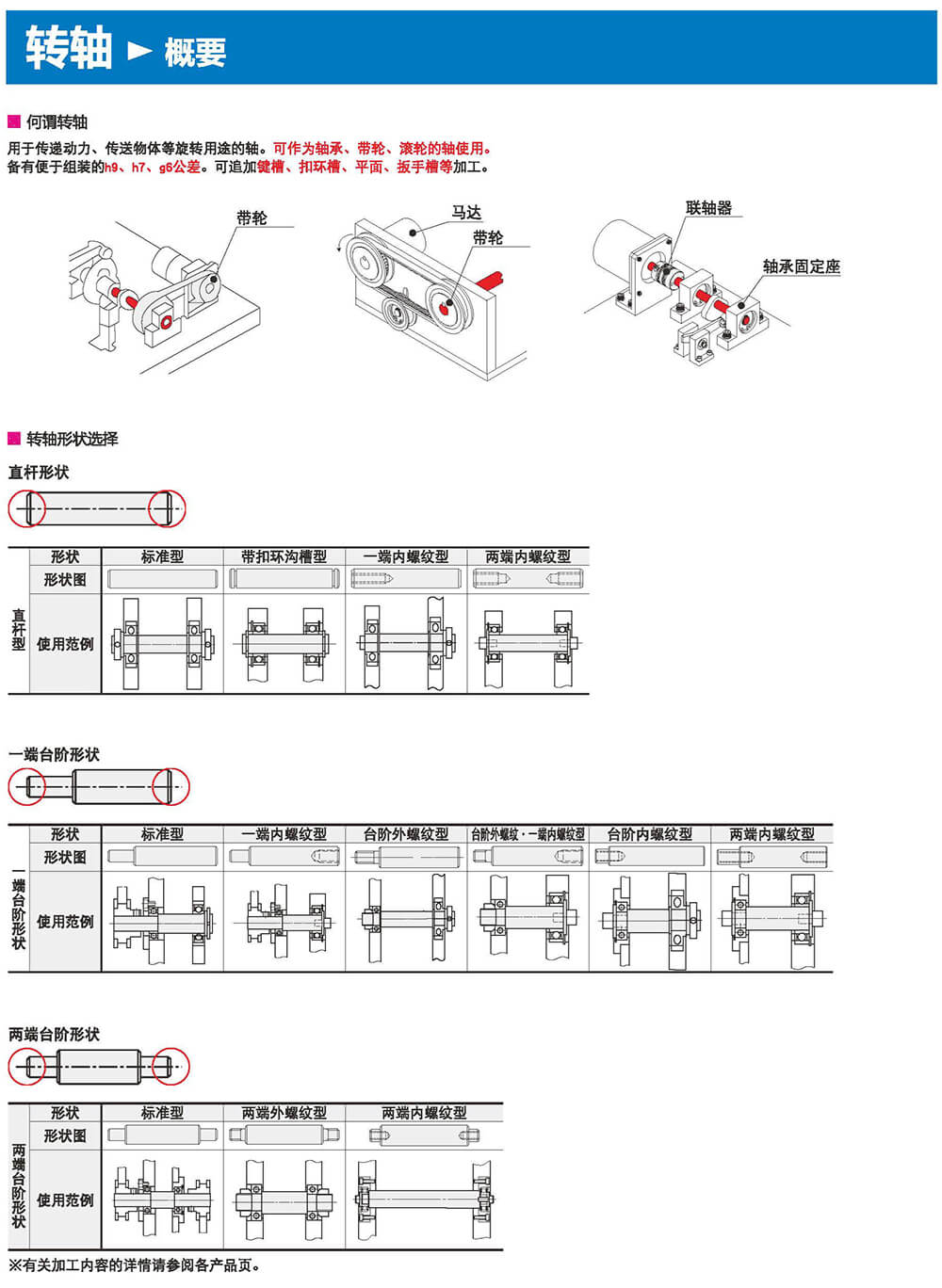 用于傳遞動(dòng)力、傳送物體等旋轉(zhuǎn)用途的軸??勺鳛檩S承、帶輪、滾輪的軸使用。 備有便于組裝的h9、h7。g6公差??勺芳渔I槽、扣環(huán)槽。平面、扳手槽等加工。