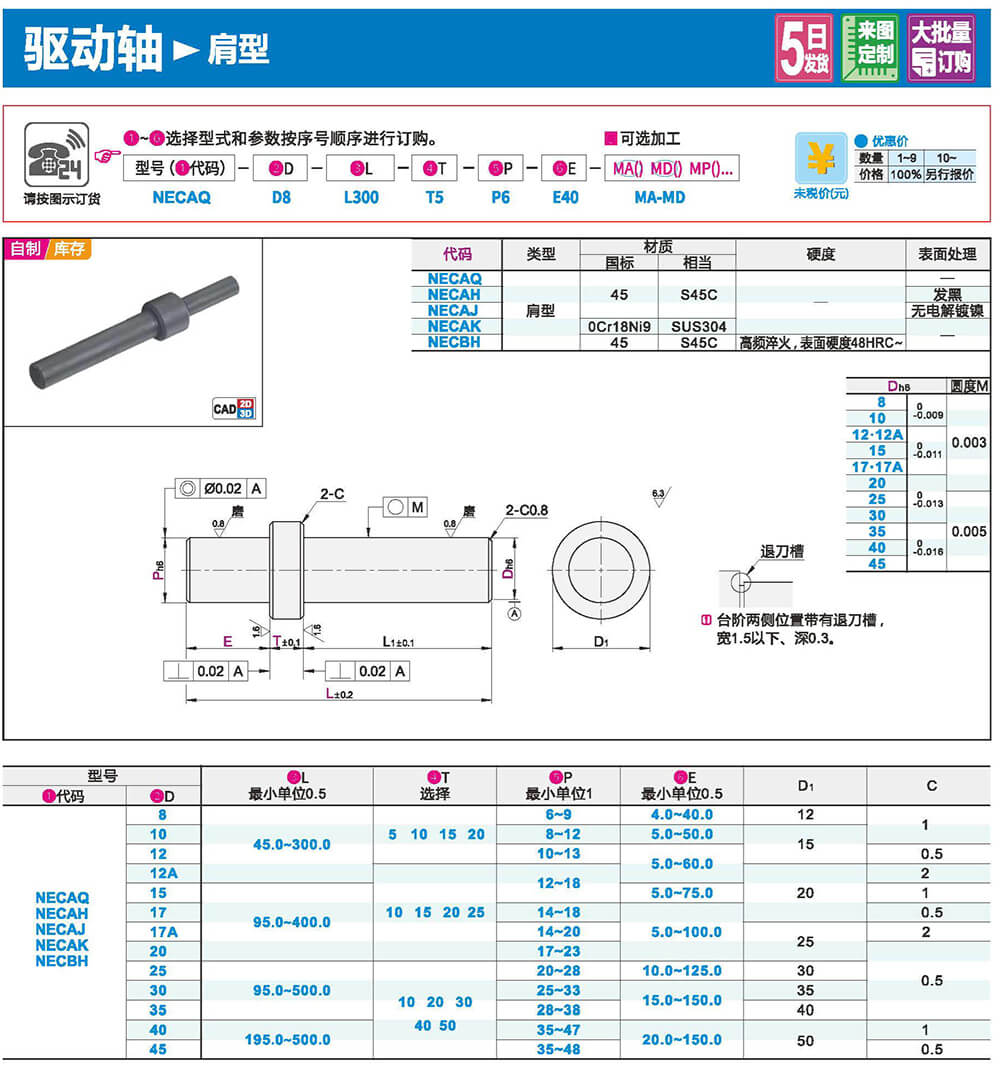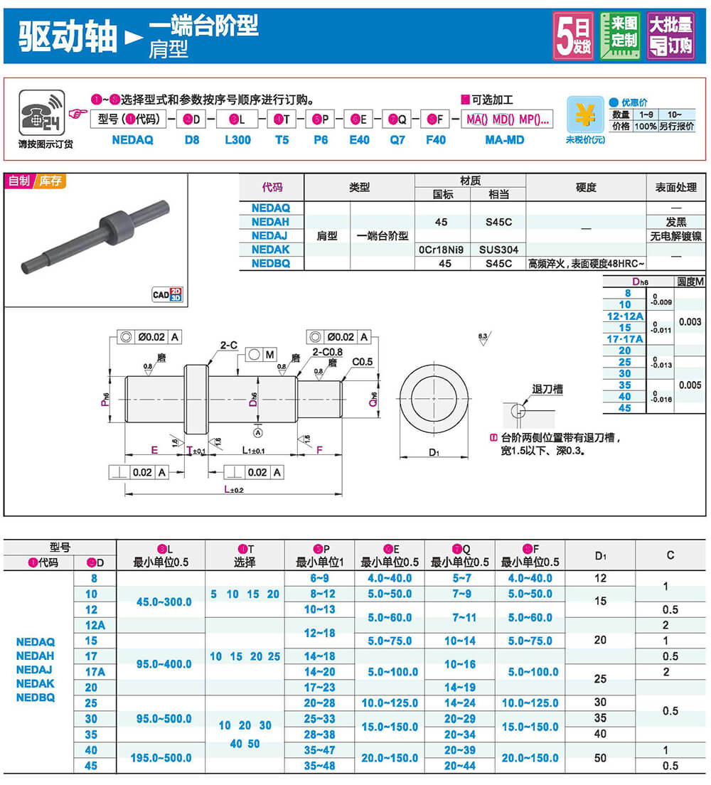 備有便于組裝的h9、h7。g6公差??勺芳渔I槽、扣環(huán)槽。平面、扳手槽等加工。